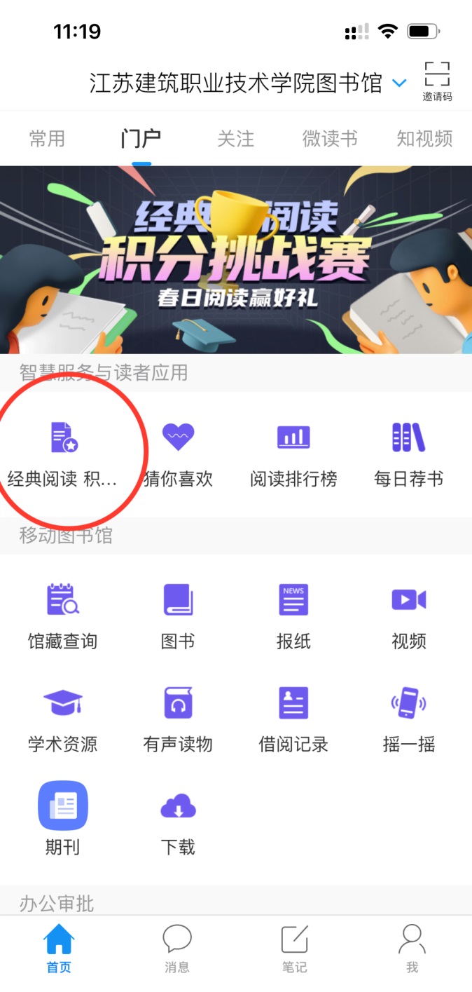 (5)点击图片或“经典阅读 积分挑战赛”模块参加活动。